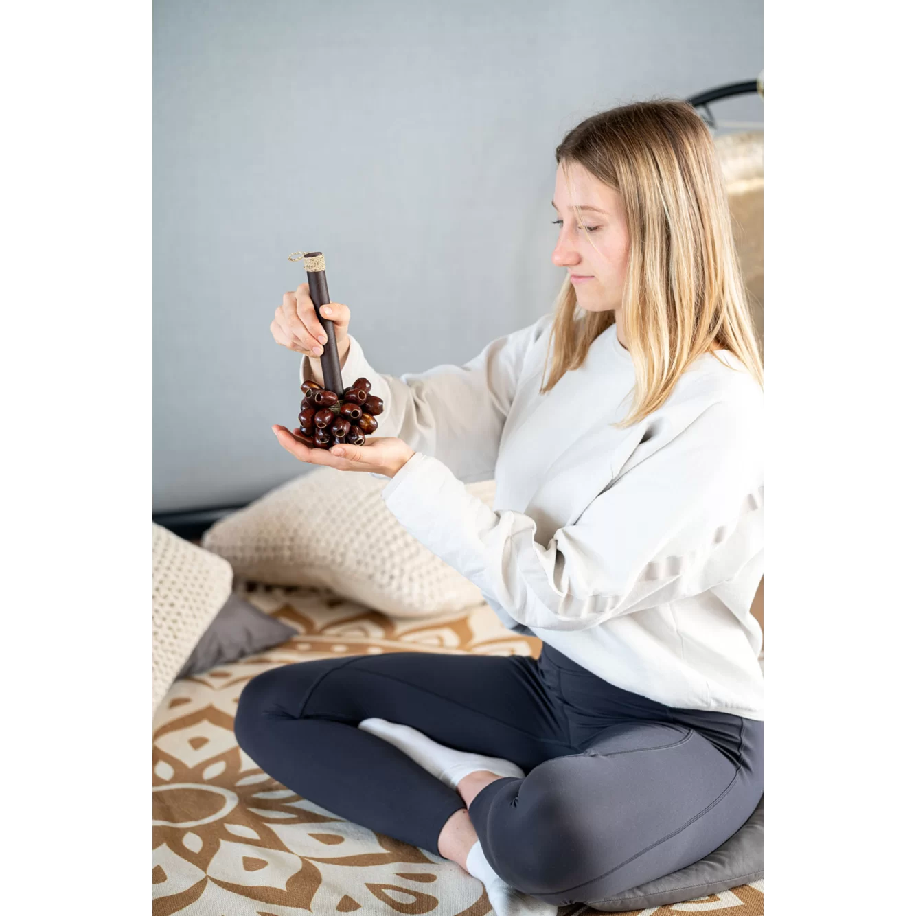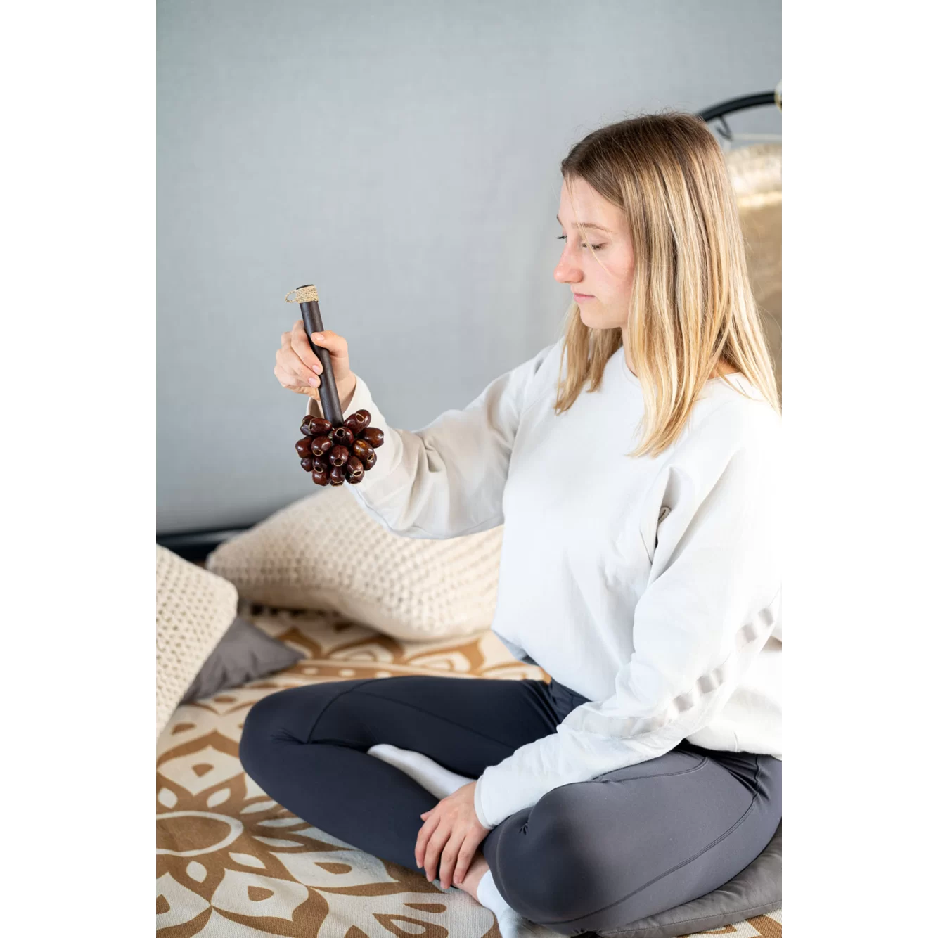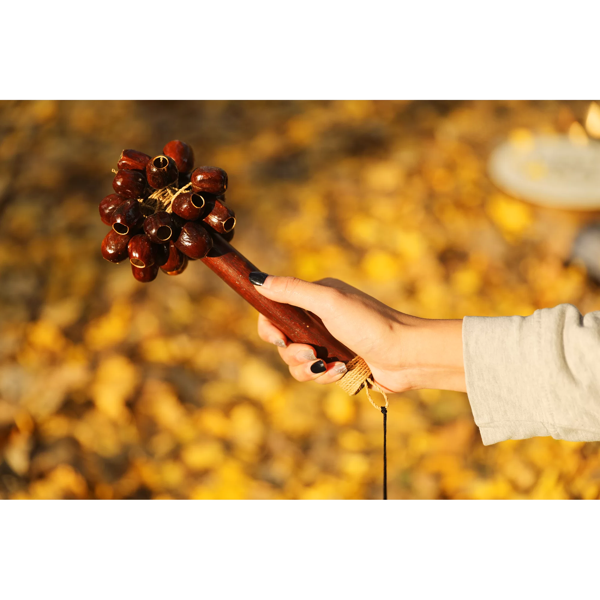 • Behagelig og glat lyd – perfekt til rolige miljøer Pala-nøddeskallernes karakteristiske klang er sprød, men afdæmpet. Resultatet er en behagelig og jævn rystelyd, der egner sig ideelt til meditative eller terapeutiske lydlandskaber.