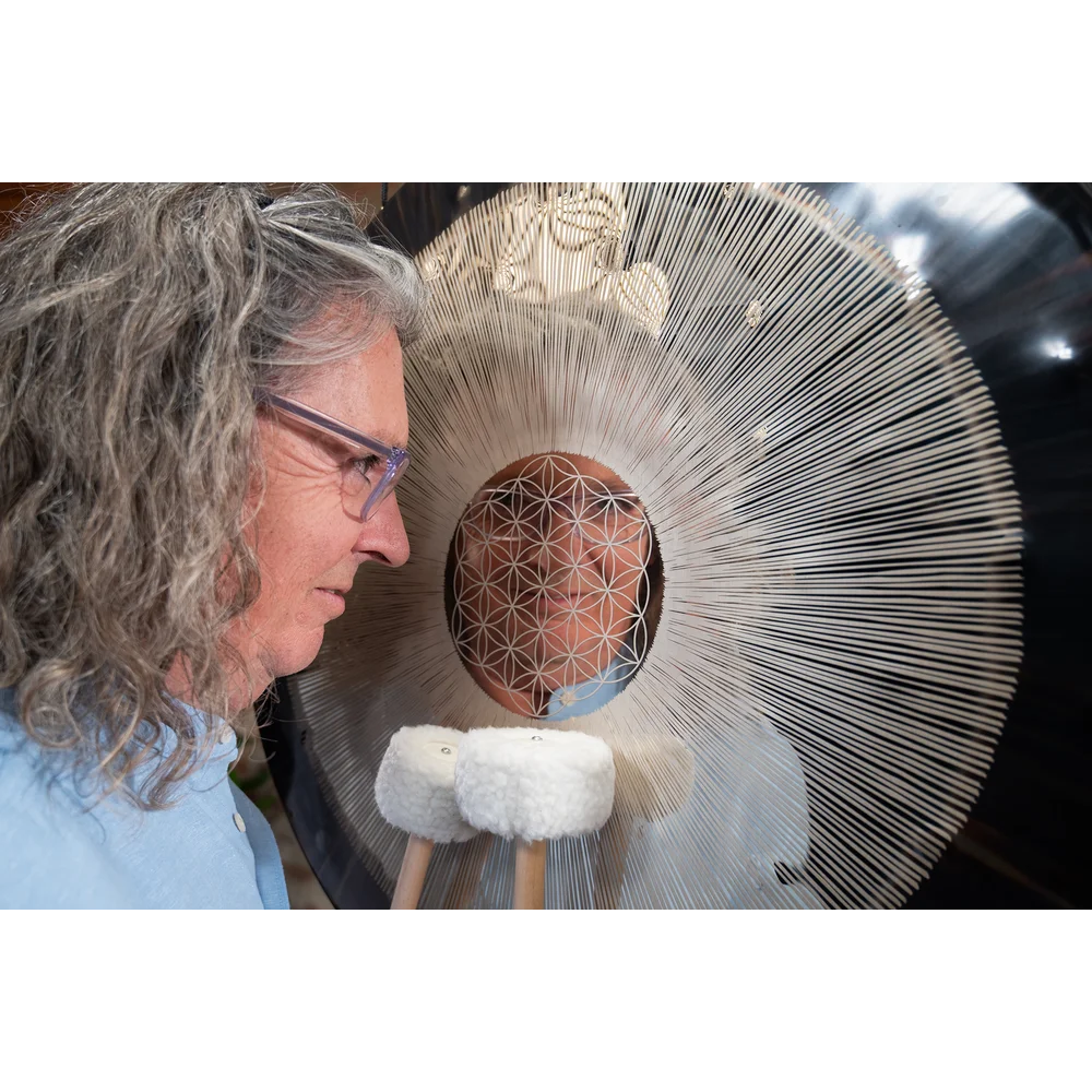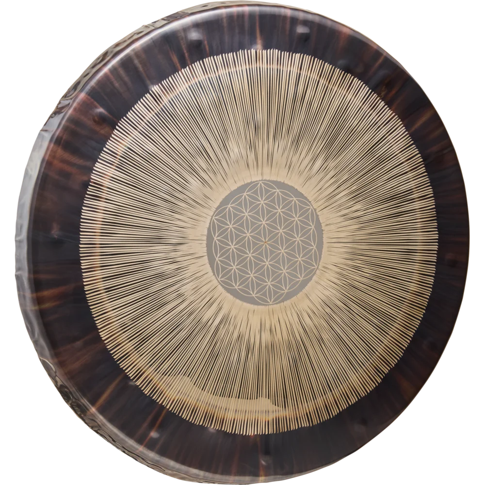 Håndværk, Materialer Og Symbolik Gongen er fremstillet i Gutenstetten, Tyskland, af nikkelsølv – et materiale kendt for sin komplekse klang og lange sustain. Flower of Life-symbolet er præcist indgraveret og repræsenterer et af menneskehedens ældste symboler, hvor tal, form og vibration smelter sammen i et udtryk for livets grundstruktur. Denne sammensmeltning af håndværk, frekvens og symbolik gør gongen til mere end et instrument – den bliver et klangligt og visuelt centrum i ethvert rum.
