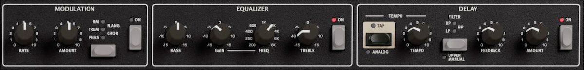 Effekter med dybde og karakter Effektsektionen i Nord Organ 3 er mere omfattende end nogensinde. Den nye Spring Reverb bringer autentisk vintagekarakter til dine klange, mens Pre-Rotary Reverb gør det muligt at placere rumklangen før rotary-effekten for endnu mere dybde. Delaysektionen har fået ny Analog-mode og feedbackfilter, og de nye modulationseffekter (Phaser, Flanger, Ring Mod, Tremolo, Chorus) gør det nemt at farvelægge dine orgellyde med både subtilitet og styrke.