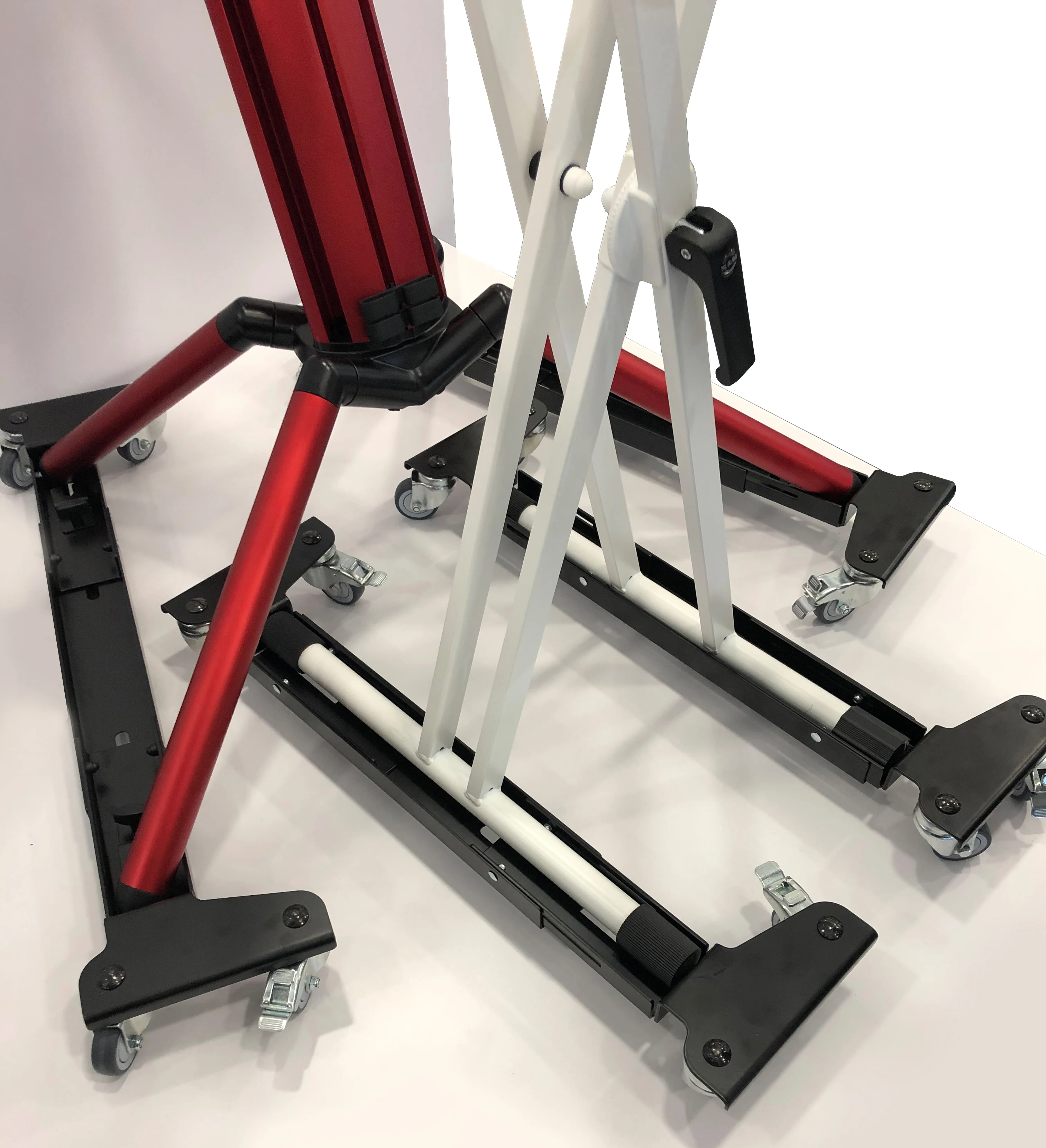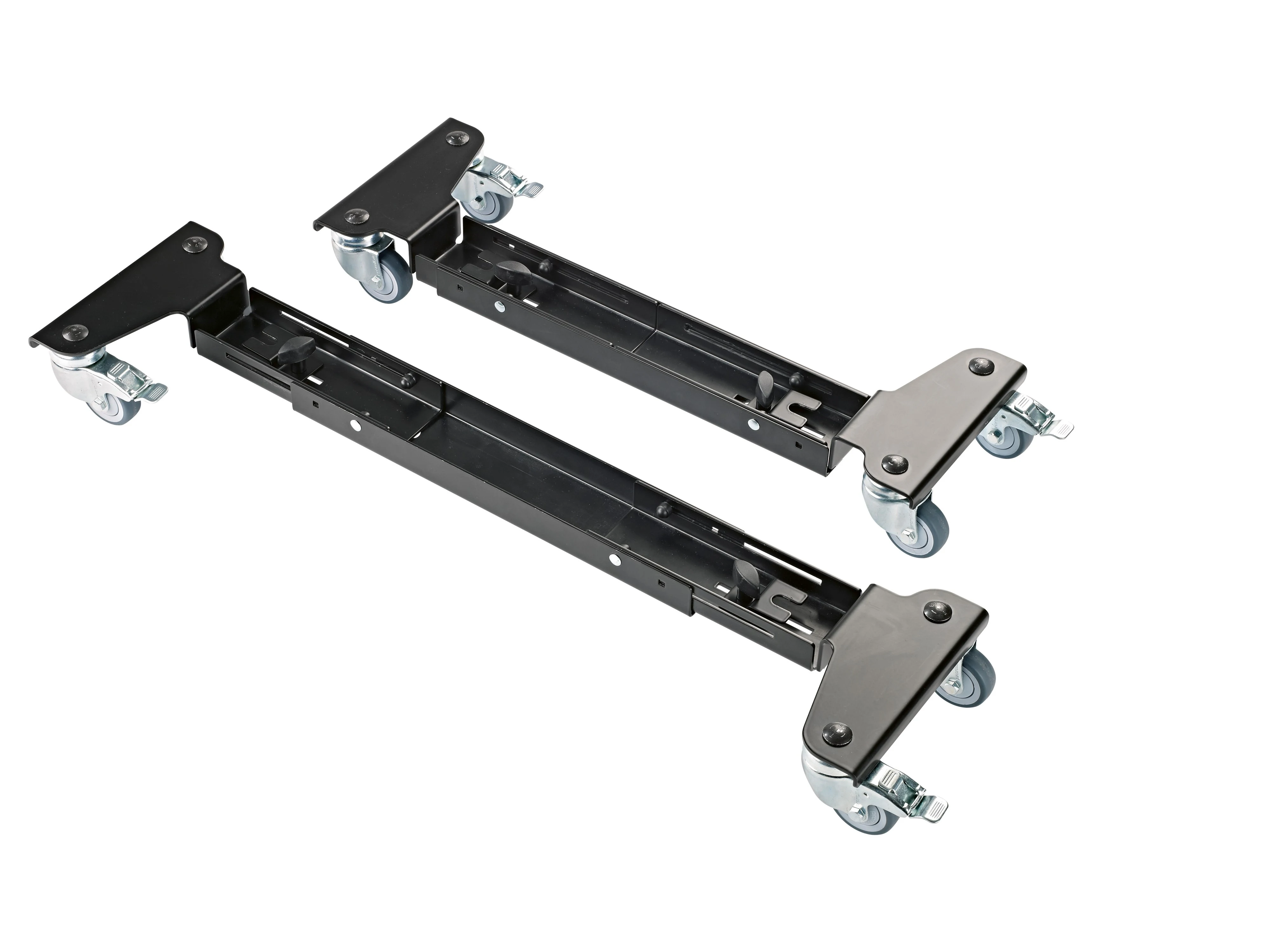 Konstruktionen består af to solide stålrammer, hver udstyret med fire hjul. Når hjullåsene aktiveres, forbliver stativet sikkert på plads – ideelt til både studie, scene og undervisningsmiljøer, hvor fleksibilitet og pålidelighed er afgørende.