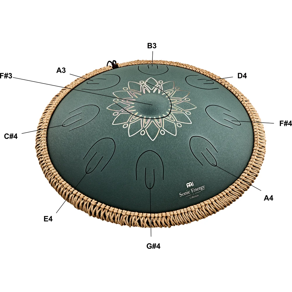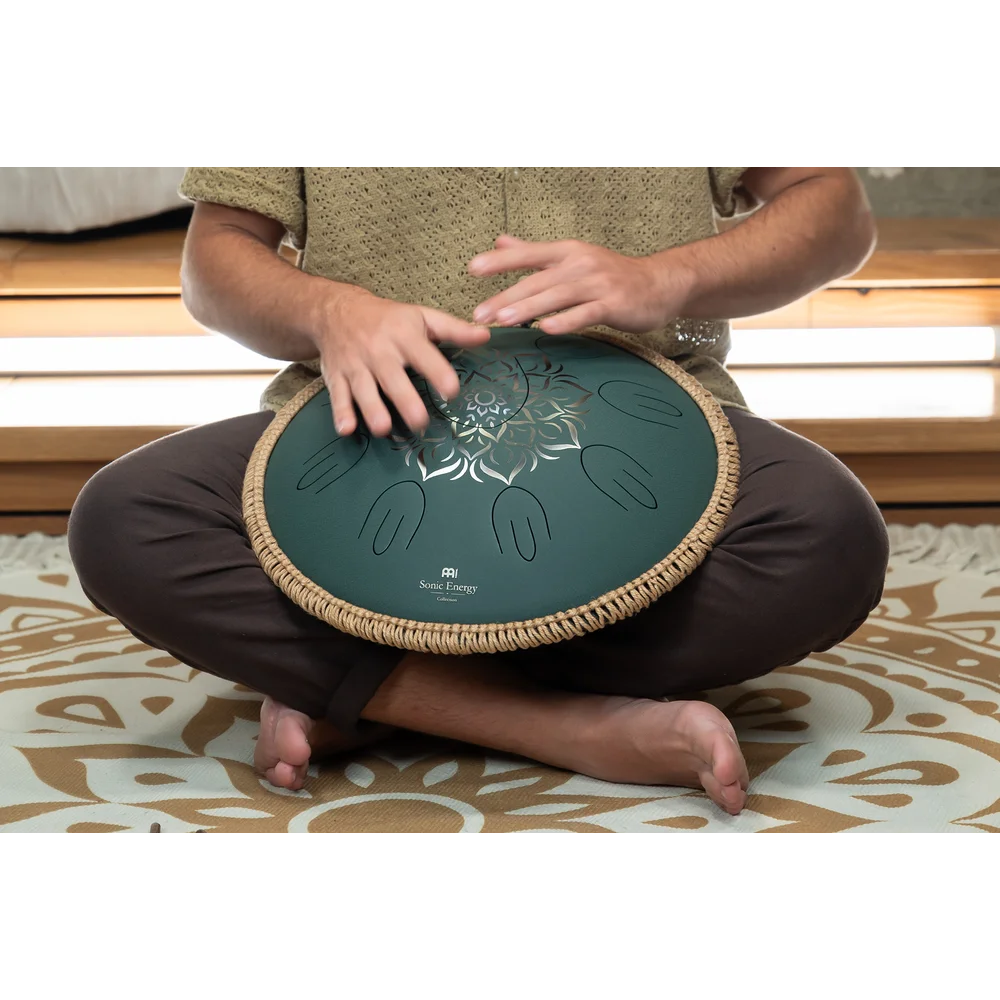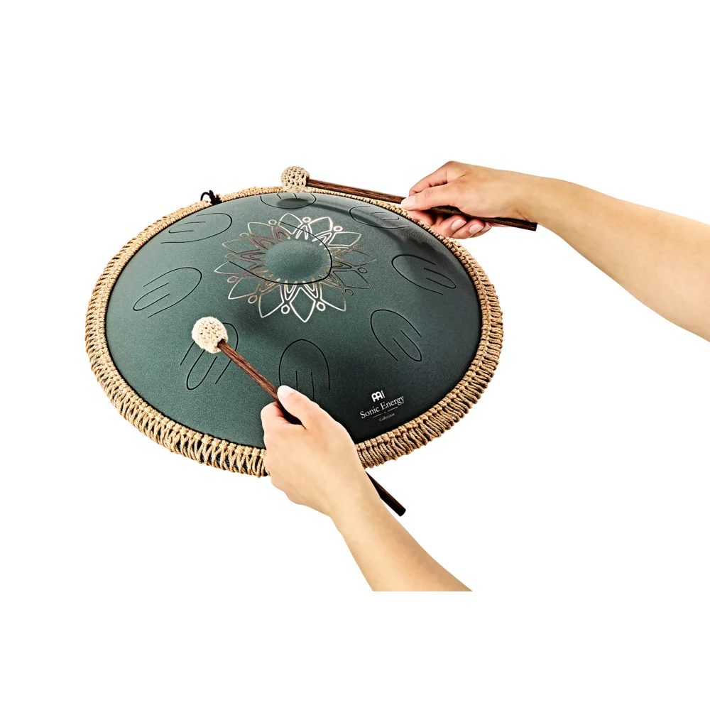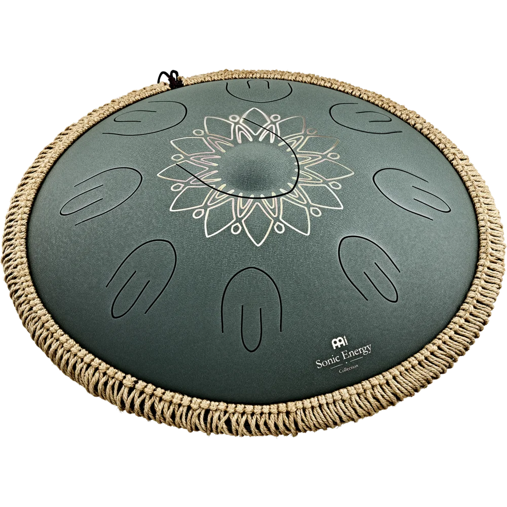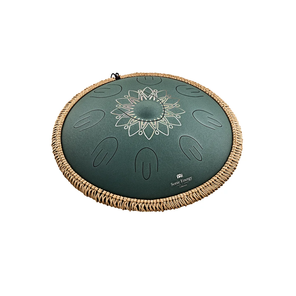 Meinl Sonic Energy OSTD4DGE Octave Steel Tongue Drum (f#-mol, 9 toner, 432 Hz, mørkegrøn, blomsterdesign) inkl. tilbehør