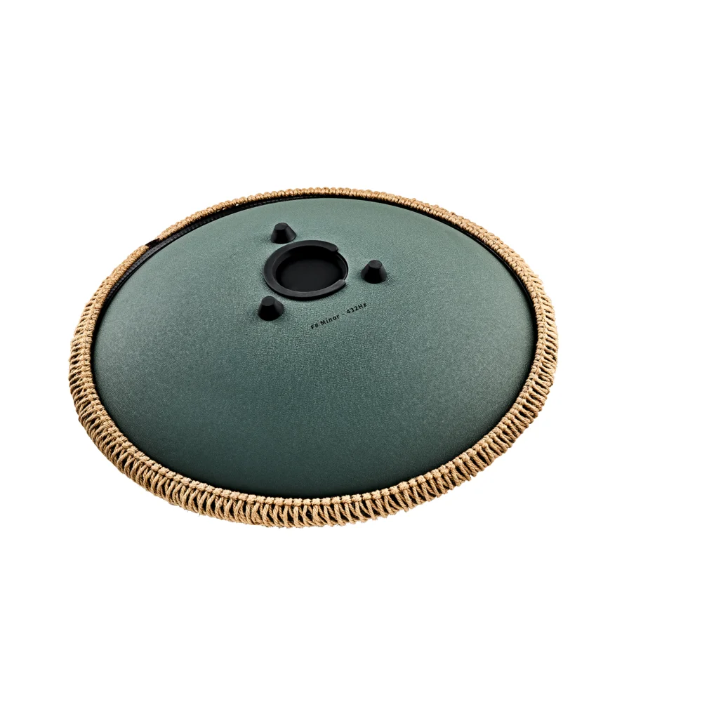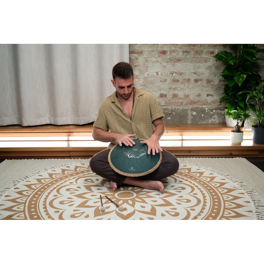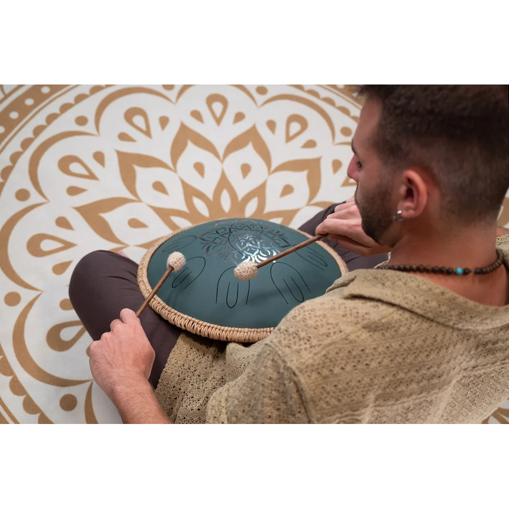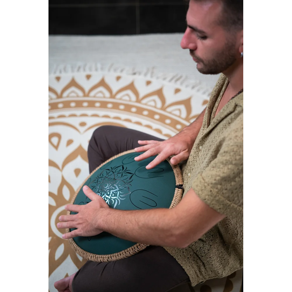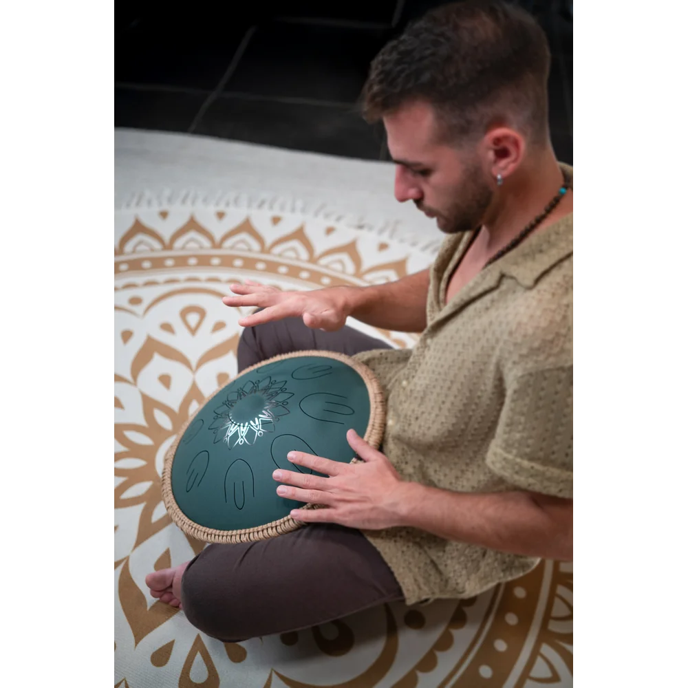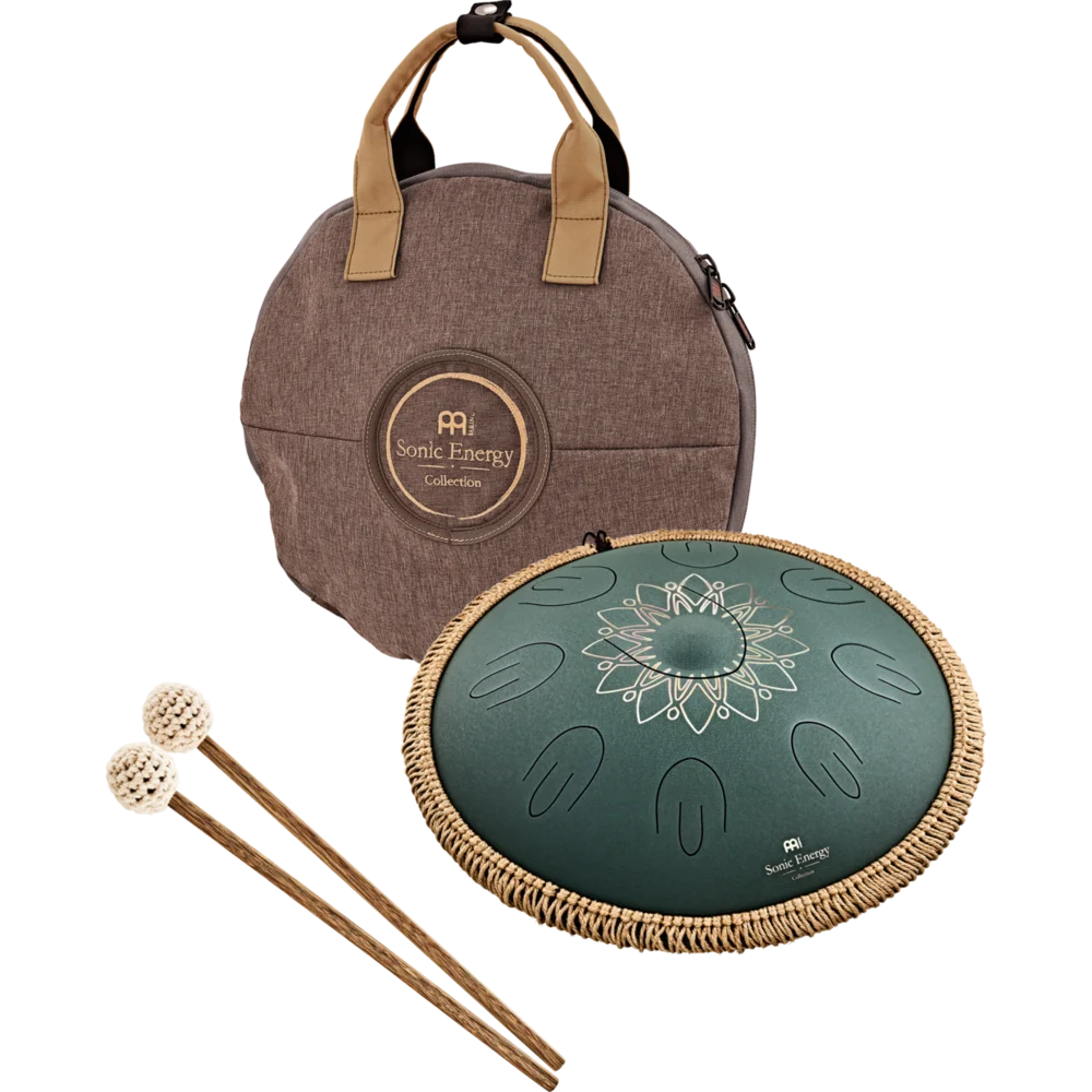 Meinl Sonic Energy OSTD4DGE Octave Steel Tongue Drum (f#-mol, 9 toner, 432 Hz, mørkegrøn, blomsterdesign) inkl. tilbehør