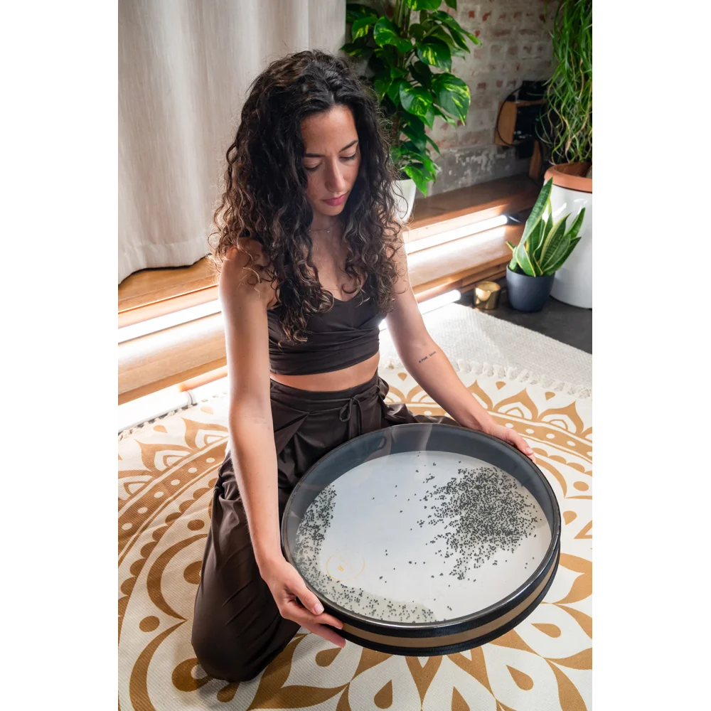 Wave Drum-konstruktionen gør instrumentet let at bruge, uanset musikalsk erfaring. Den tætte, men levende lyd gør den velegnet til både guidede sessioner og fri, intuitiv brug, hvor klangen understøtter afslapning og sanselig fordybelse. Den forseglede påfyldningsport gør det muligt at justere mængden af perler indeni trommen, så klangens intensitet og bevægelse kan tilpasses individuelle præferencer og brugssituationer.