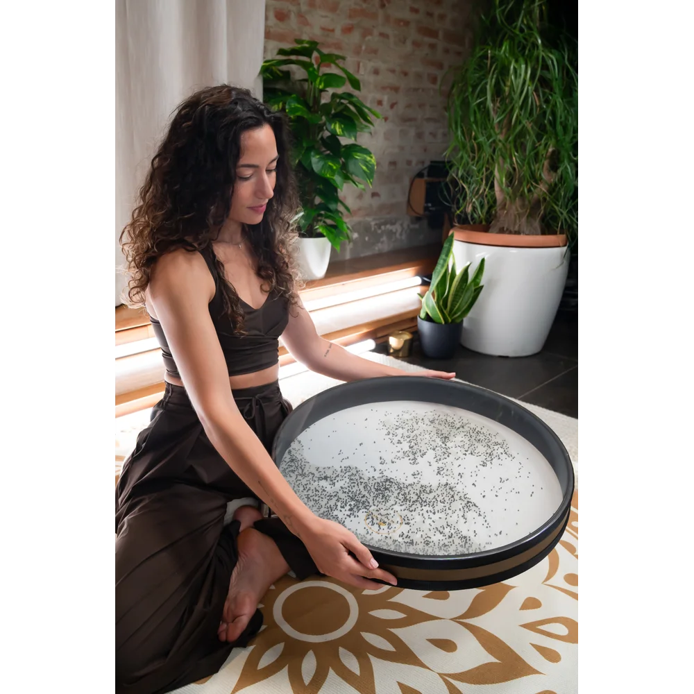 Den store diameter giver et udvidet klangrum, hvor selv langsomme bevægelser skaber brede, rolige lydbølger. Instrumentet kræver ingen musikalsk erfaring og fungerer intuitivt i både terapeutiske, meditative og musikalske sammenhænge. Den forseglede påfyldningsport gør det muligt at justere mængden af perler i trommen, så klangens intensitet og tempo kan tilpasses den ønskede stemning – fra blid baggrundslyd til mere tydelige, rytmiske bølgebevægelser.
