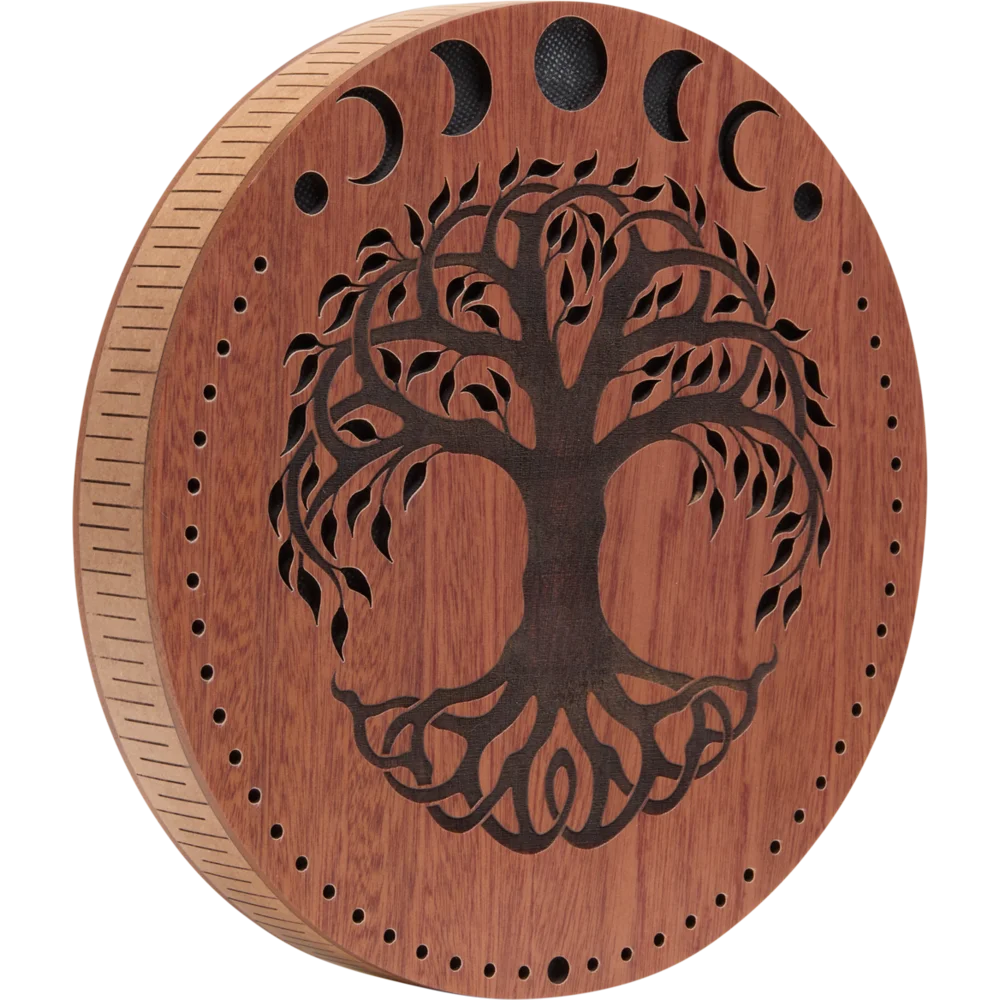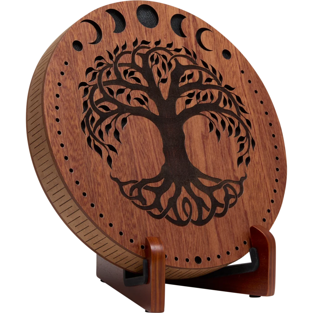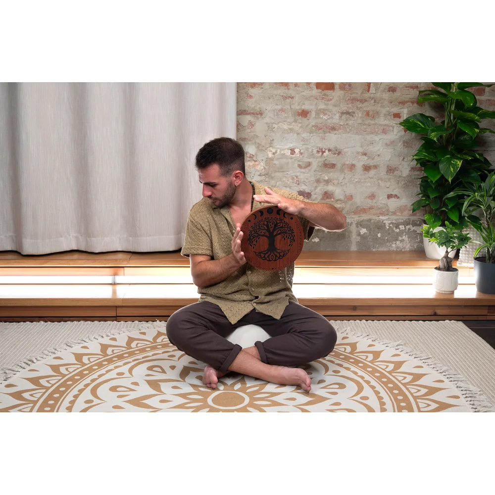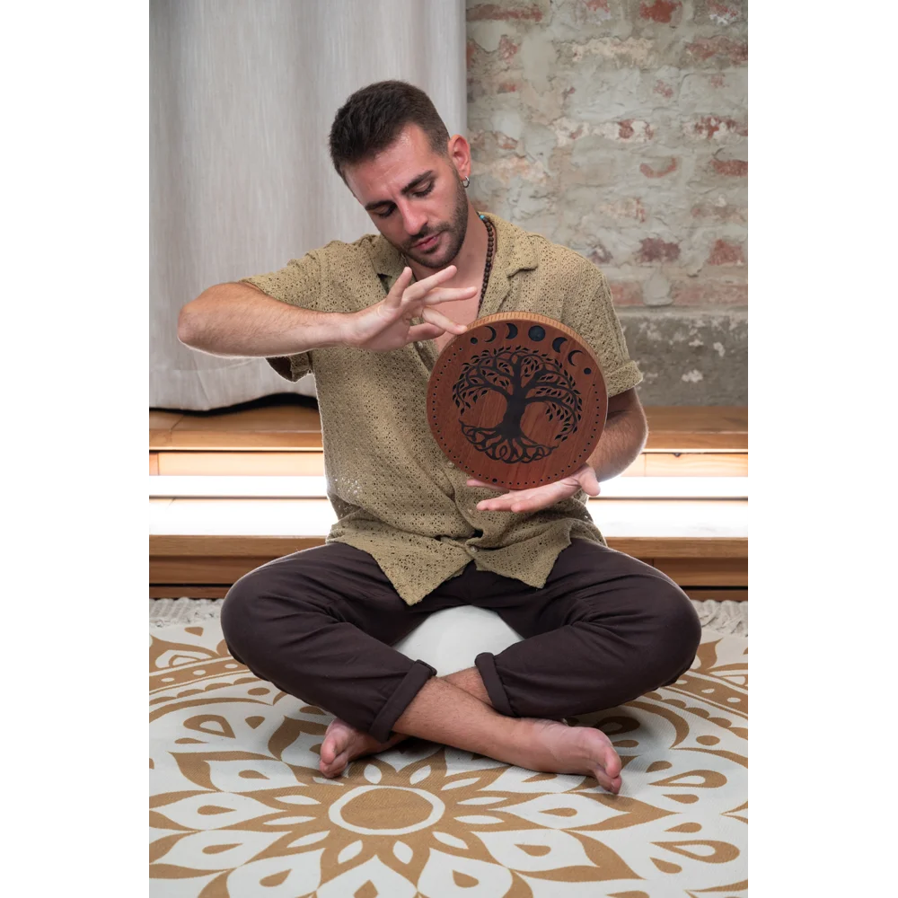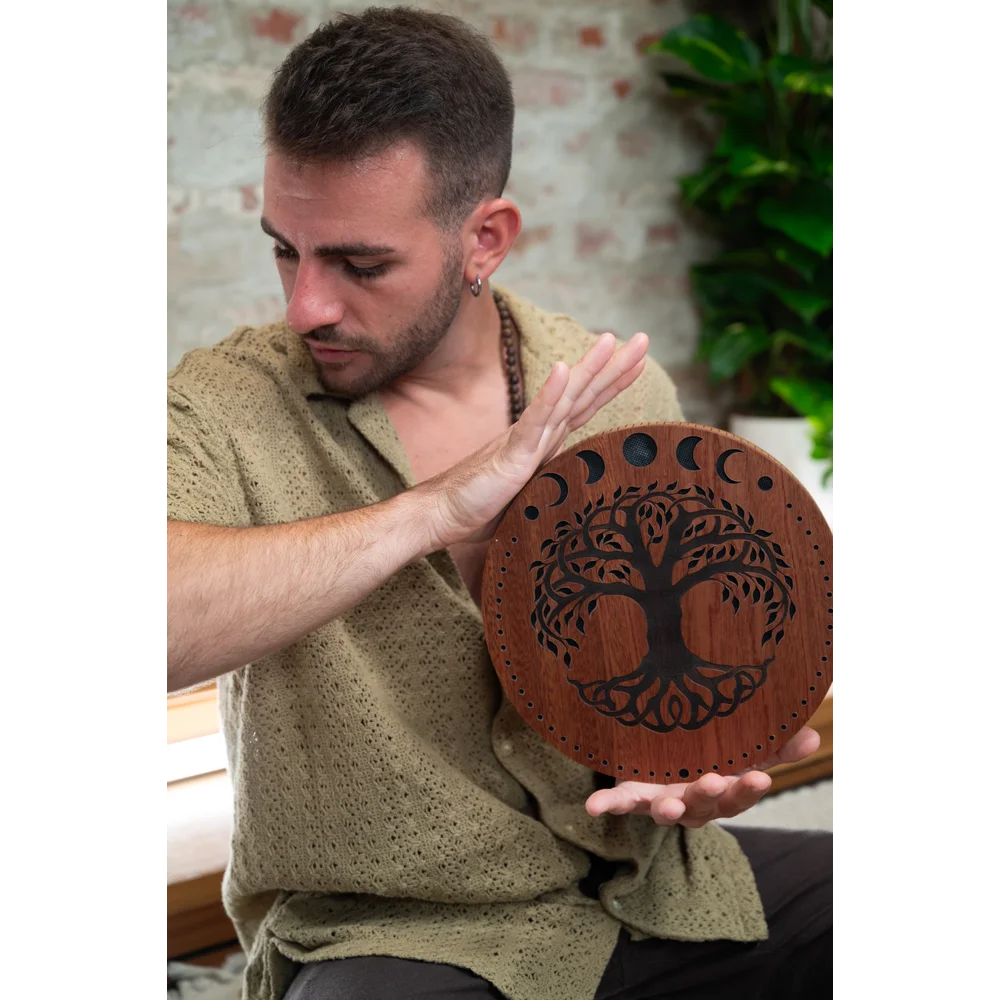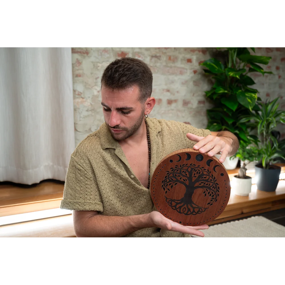 Regn disken er smukt udformet med udskårne symboler inspireret af månefaserne og Livets Træ, som tilfører både visuel dybde og symbolsk betydning. Kombinationen af lyd, bevægelse og symbolik gør RDS10MTOL velegnet til afslapning, lydterapi, meditation og mindful musikalsk udforskning. Hver regn disk leveres med en blød opbevaringspose og et træstativ, så instrumentet både kan beskyttes og præsenteres elegant, når det ikke er i brug.