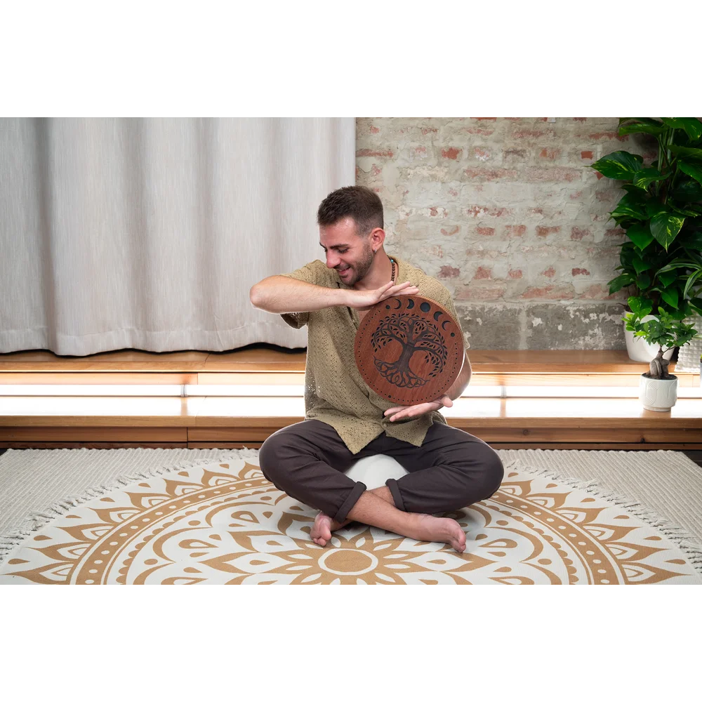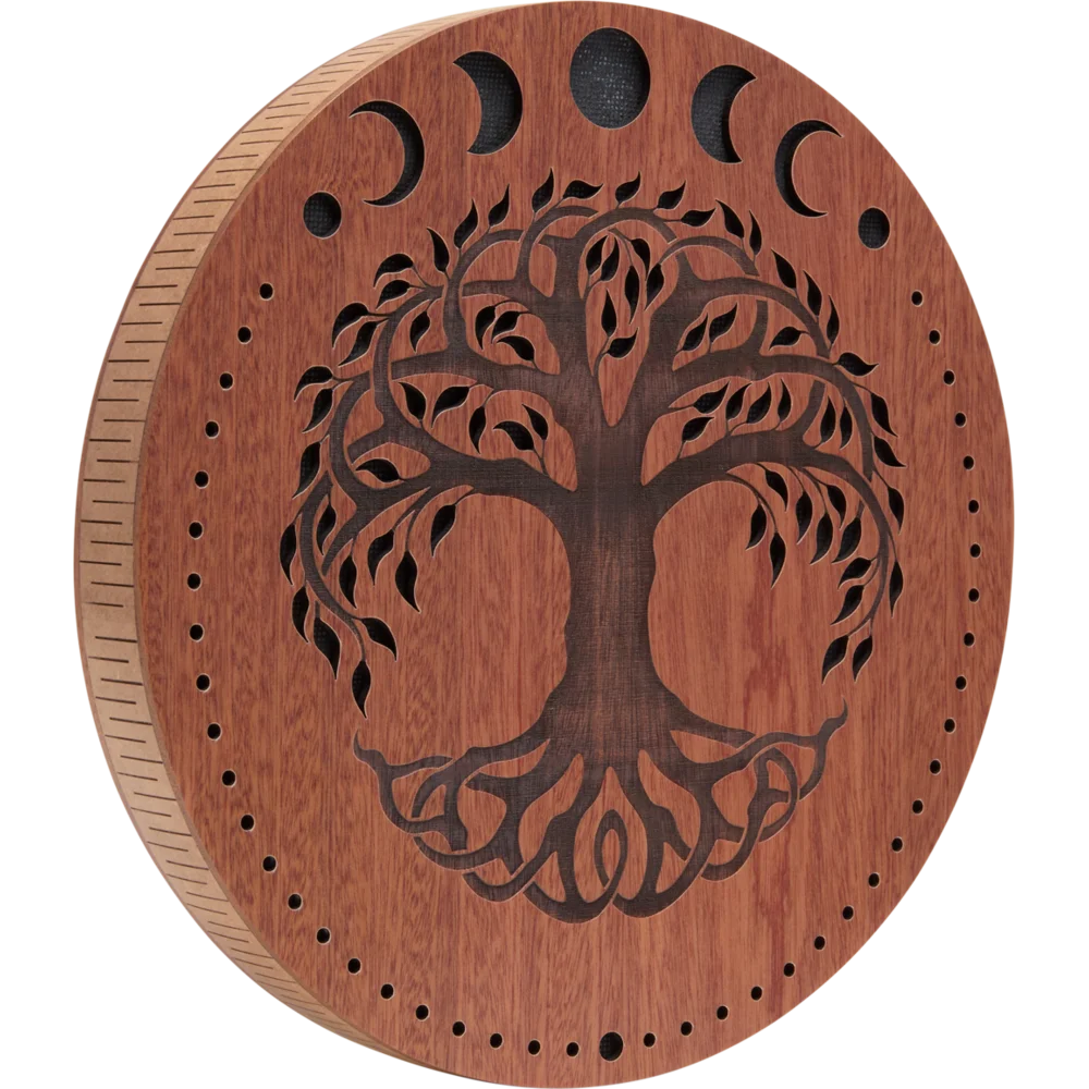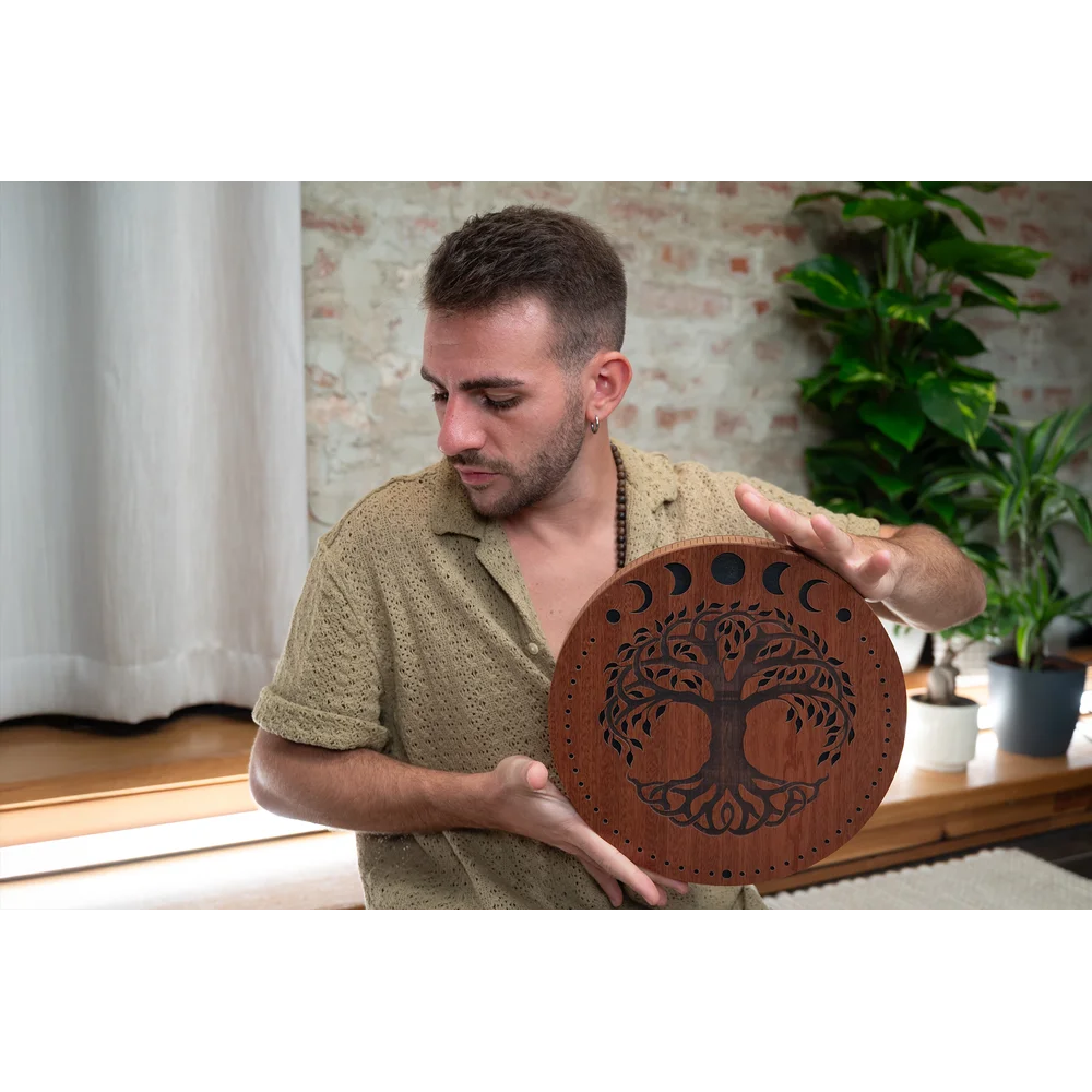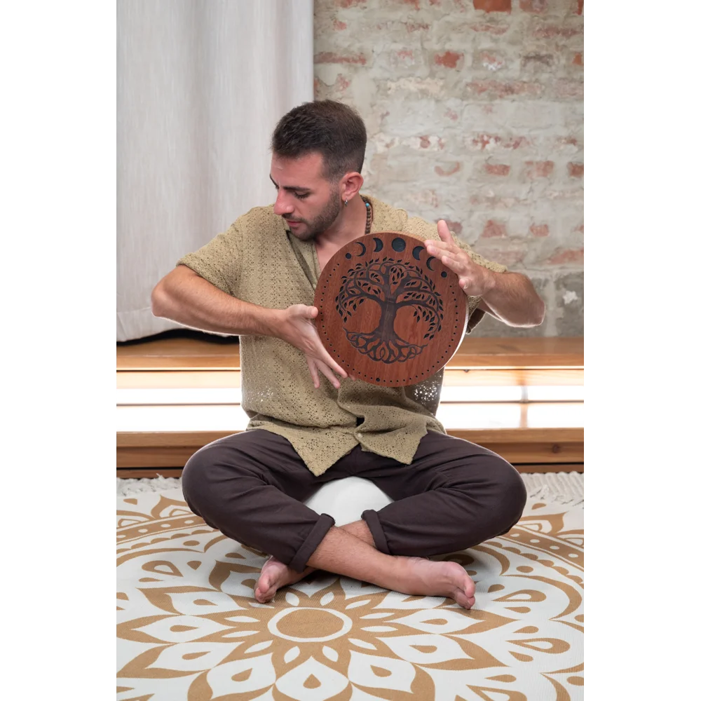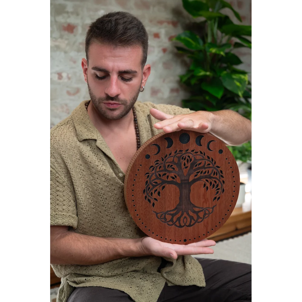 Regn disken er udsmykket med udskårne symboler inspireret af månefaserne og Livets Træ, som tilfører både visuel styrke og symbolsk dybde. Kombinationen af lyd, bevægelse og form gør RDS12MTOL særligt velegnet til meditation, lydterapi, mindfulness og stemningsskabende musikalske sessioner. Instrumentet leveres med en blød opbevaringspose og et træstativ, så det både kan transporteres sikkert og præsenteres elegant, når det ikke er i brug.