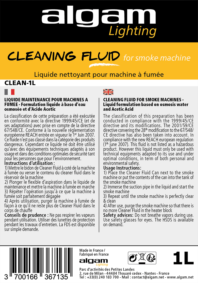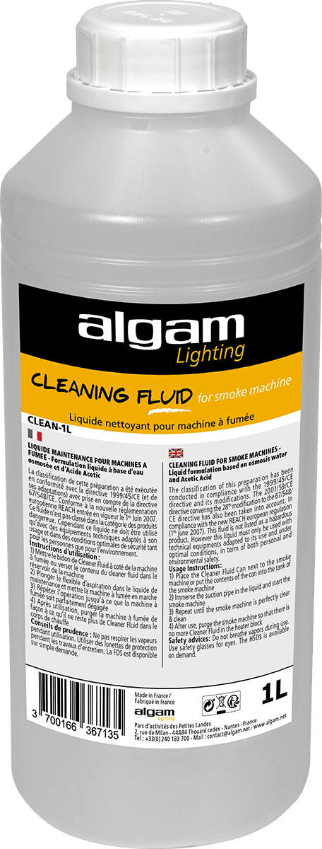 Algam Lighting CLEAN 1L er en specialudviklet rengøringsvæske til røg-, dis- og tågemaskiner. Den hjælper med at fjerne ophobede rester i varmelegemer og væskekanaler, hvilket sikrer længere levetid, bedre ydelse og en mere stabil drift. Perfekt til både private brugere og professionelle, der vil holde deres udstyr i topform.