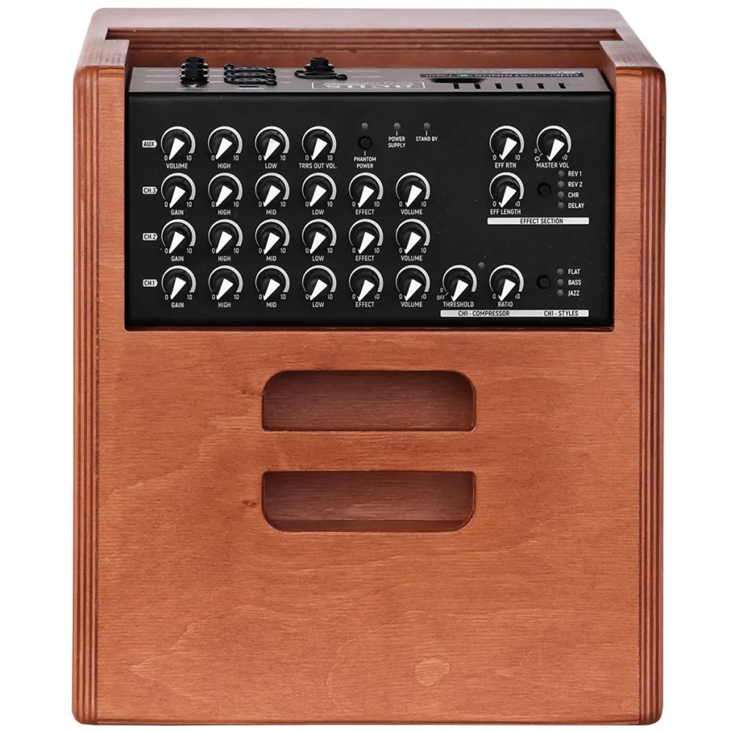 Kraftfuld lyd – kompakt design Kabinettet er fremstillet af solid krydsfiner med elegant træfinish, der kombinerer lav vægt (10,4 kg) med robusthed og naturlig resonans. Forstærkeren rummer en 8” woofer og 1” dome tweeter, der tilsammen dækker frekvensområdet 40 Hz – 20 kHz. Resultatet er en varm, transparent lyd med både dyb bund og klar diskant – perfekt til akustiske optrædener og studiebrug.